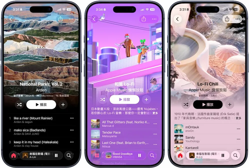 Apple Music这次变化是最多的。动态封面上线,部分专辑和播放列表页面会显示全屏动态背景,沉浸感确实更强。