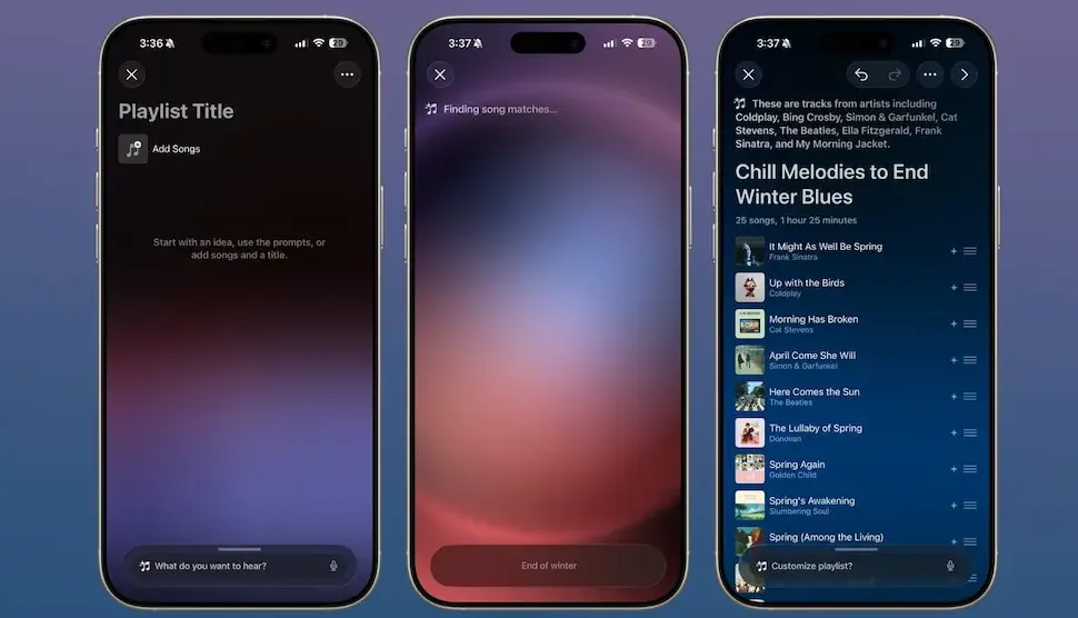 更值得注意的是AI生成歌单——苹果把这个功能叫做播放清单Playground,用文字描述你想听的氛围,系统就自动生成一份完整歌单出来,连标题和曲目都配好。