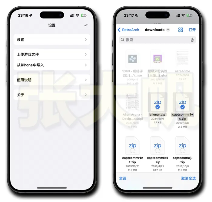 将压缩包保存在系统文件APP内,记住保存路径,然后在模拟器-设置-从iPhone中导入,找到刚下载的游戏压缩包即可。