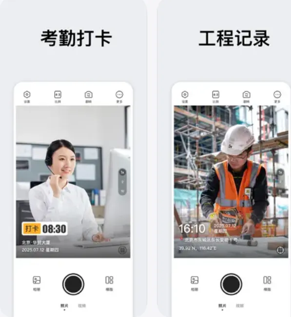 为照片或视频加上实时GPS坐标,显示精确位置、城市与经纬度,特别适合外勤打卡和旅行记录,用在施工、房产、巡检、户外活动等场合都很合适。