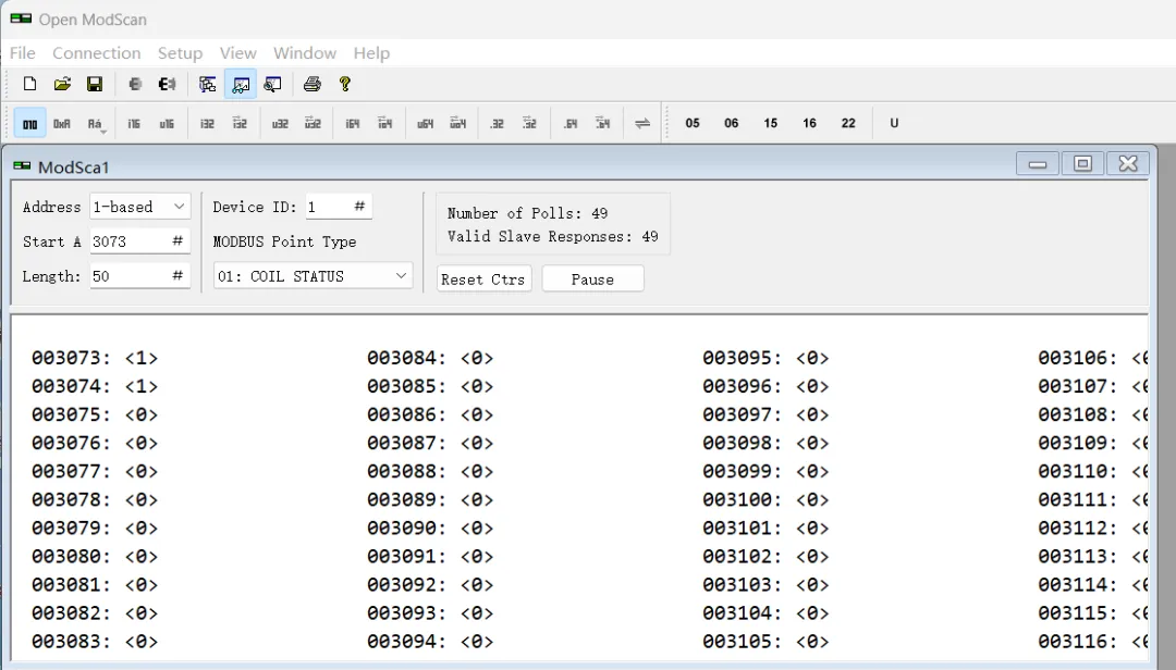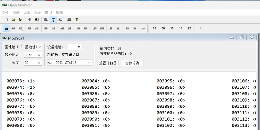 和Modscan32同样的设置在OpenModscan里就没有出现接收超时的报错信息。好使没毛病!