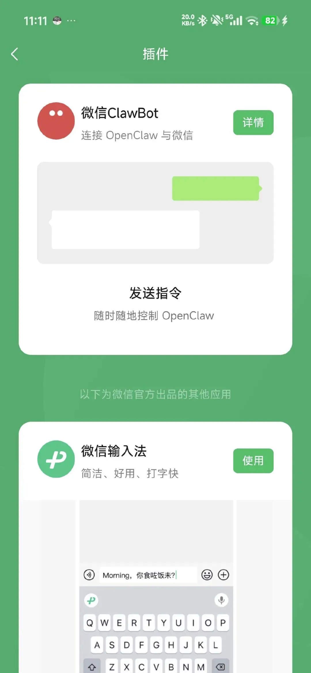 去手机插件里也能看到 clawbot 了