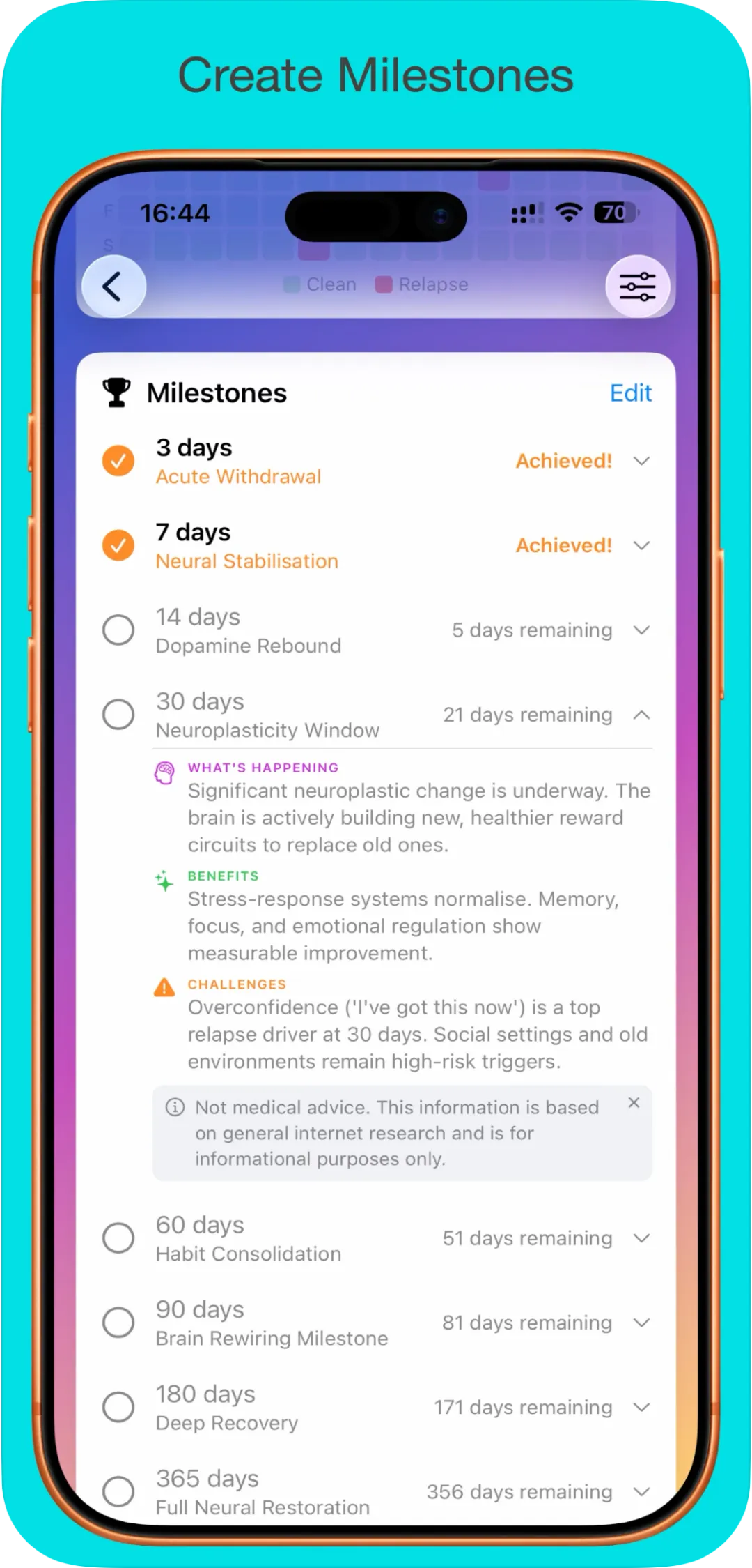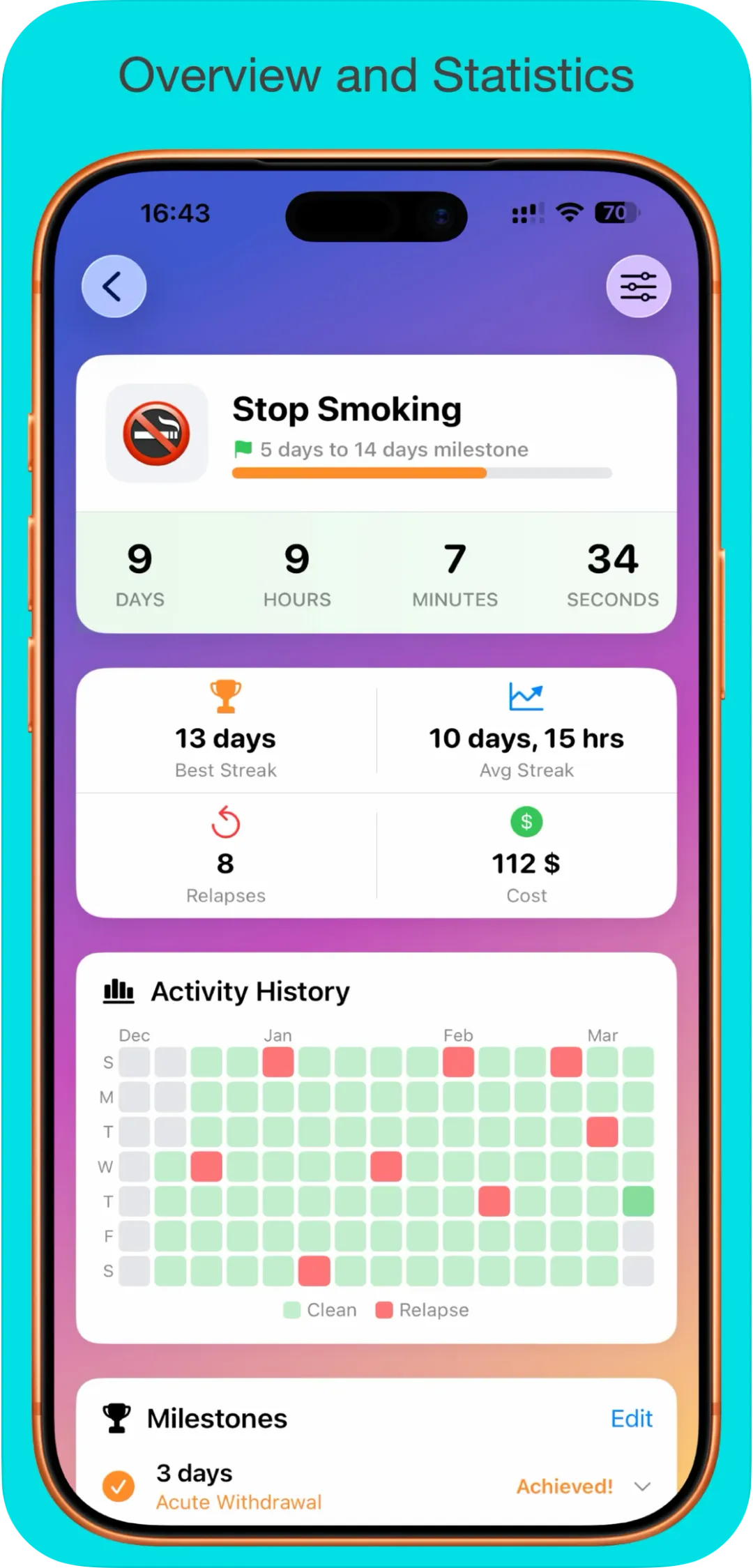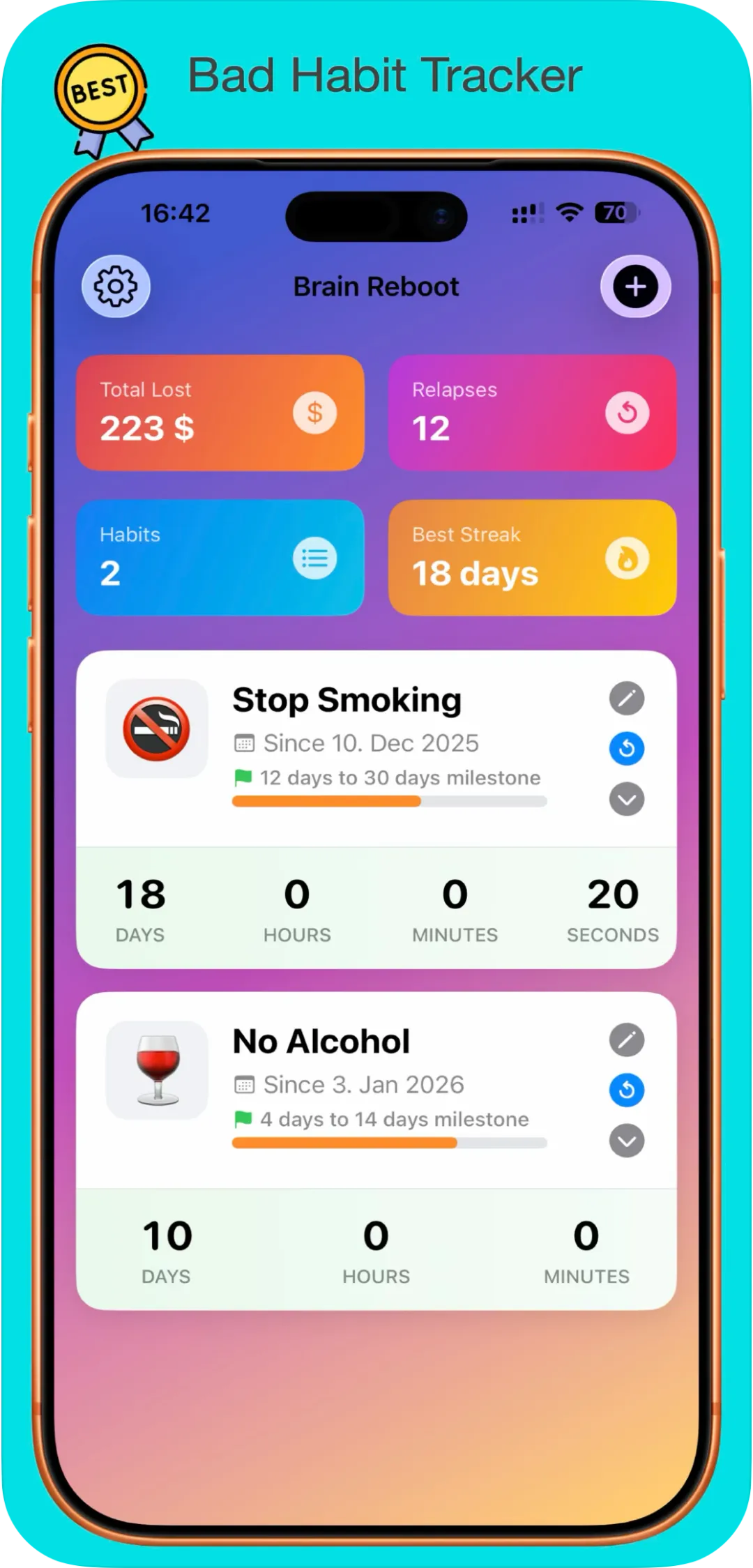 一款坏习惯跟踪记录软件。连续记录天数及复发情况,帮你快速戒掉坏习惯。