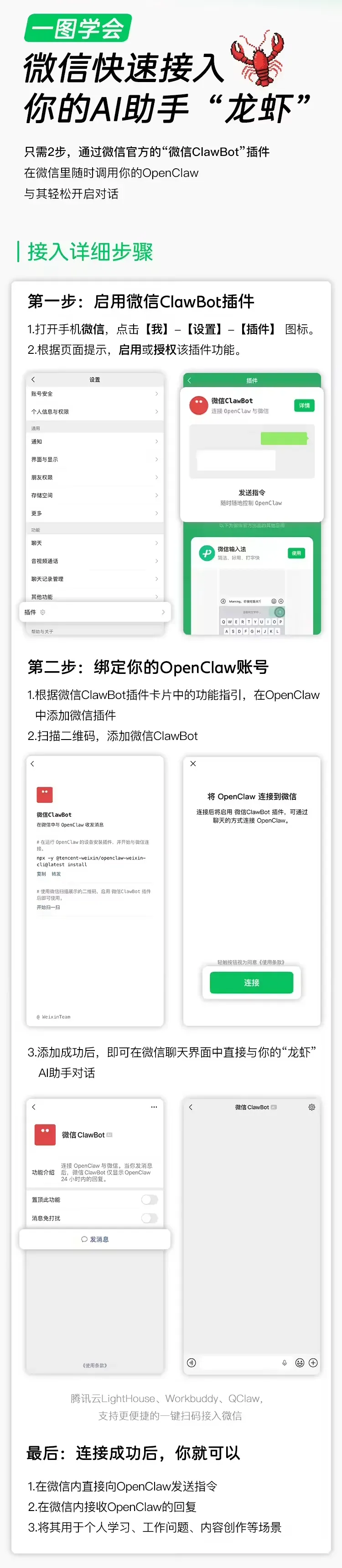 你可以在自己的电脑、NAS、或者云服务器上部署一个OpenClaw,然后扫码跟微信连上,以后在微信里就能跟它收发消息。