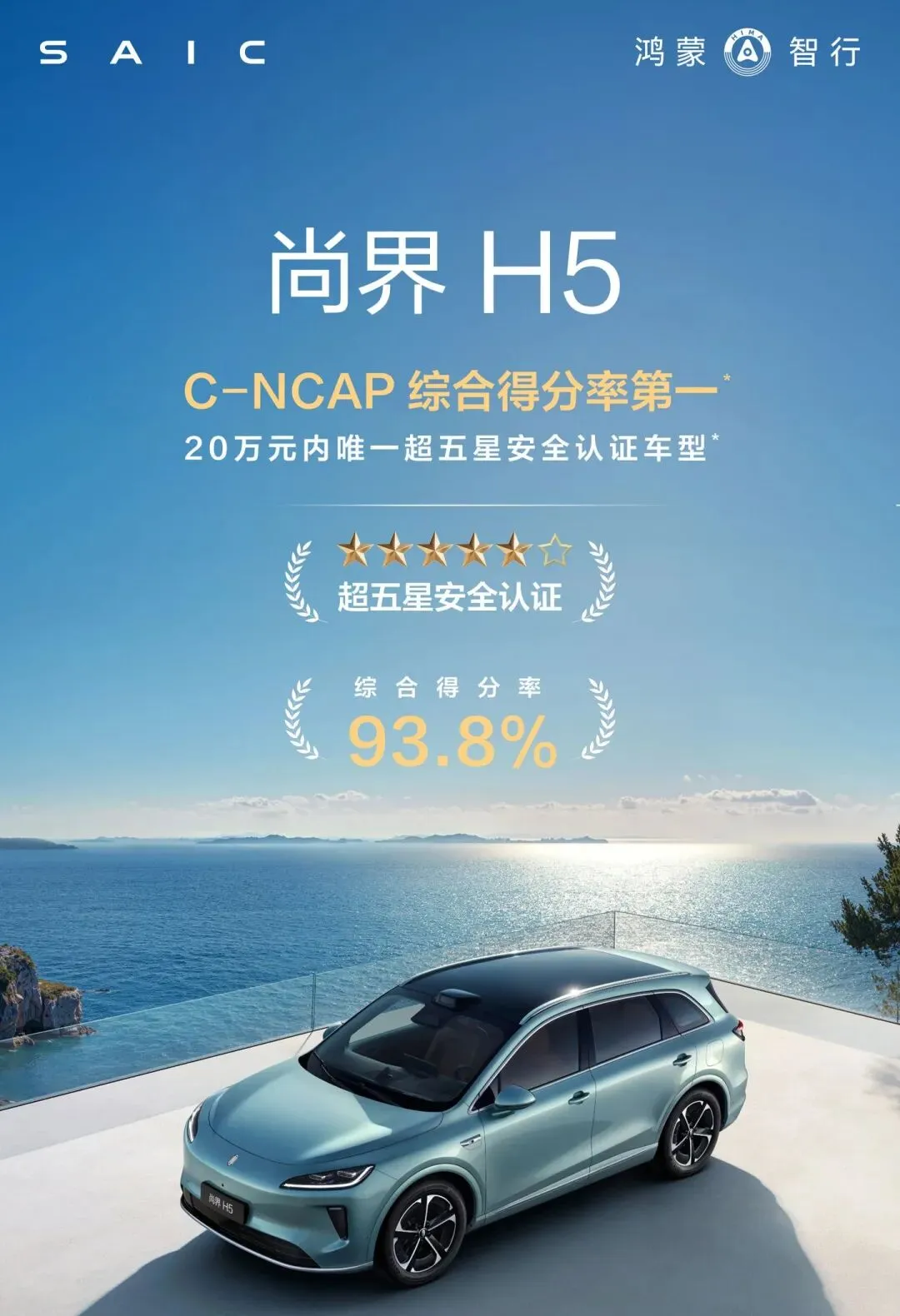 安全层面,在C-NCAP测试中,尚界H5拿下了93.8%的综合得分率,乘员保护得分率更是高达98.27%,创下历史新高,成为20万以内罕见获得超五星认证的车型。