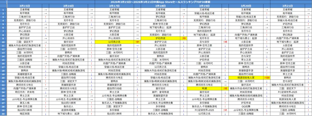 毎週月曜日は、先週の中国iOSゲームセールスランキングに関する注目ニュースをお届けしますが、下記の画像は、先週(2026年3月15日~3月21日)の中国iOSゲームセールスランキングTOP30です。