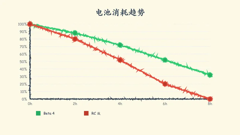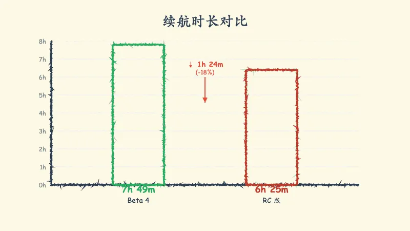 亲测下来,这种“负优化”真的让人无语。那最气人的是什么?是 Beta 4 哪怕在我重度刷 YouTube(连看 4 小时那种!)的情况下,表现都还挺稳;可到了 RC 版,我只是正常刷刷朋友圈、回回消息,电量就跟开了闸的水一样往下掉。这种即使不干重活也“尿崩”的焦虑感,谁懂啊!