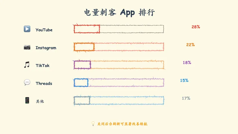 进去之后别光看那个健康度,往下拉,重点盯着那个“App 每小时电量消耗”列表!我在测试中发现,虽然 YouTube 是个大户,但有些版本下连 Threads 这种 App 都会莫名其妙地在后台偷电。所以大家一定要根据自己的列表,精准揪出那个属于你的“电量刺客”,然后果断关掉它的后台刷新,谁用谁知道哈!