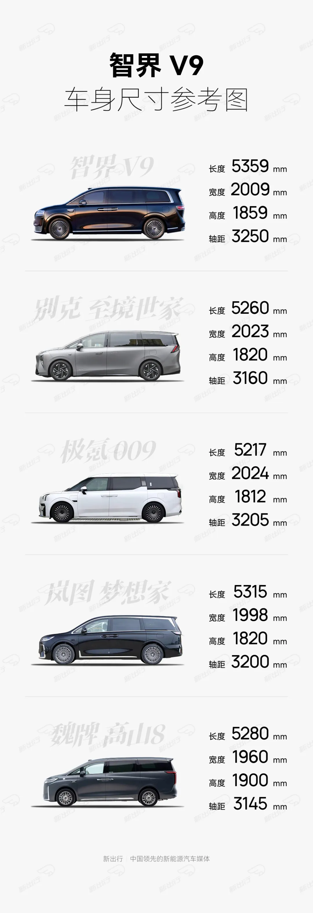 尺寸方面,智界 V9 的长宽高分别为 5359*2009*1859mm,轴距为 3250mm。