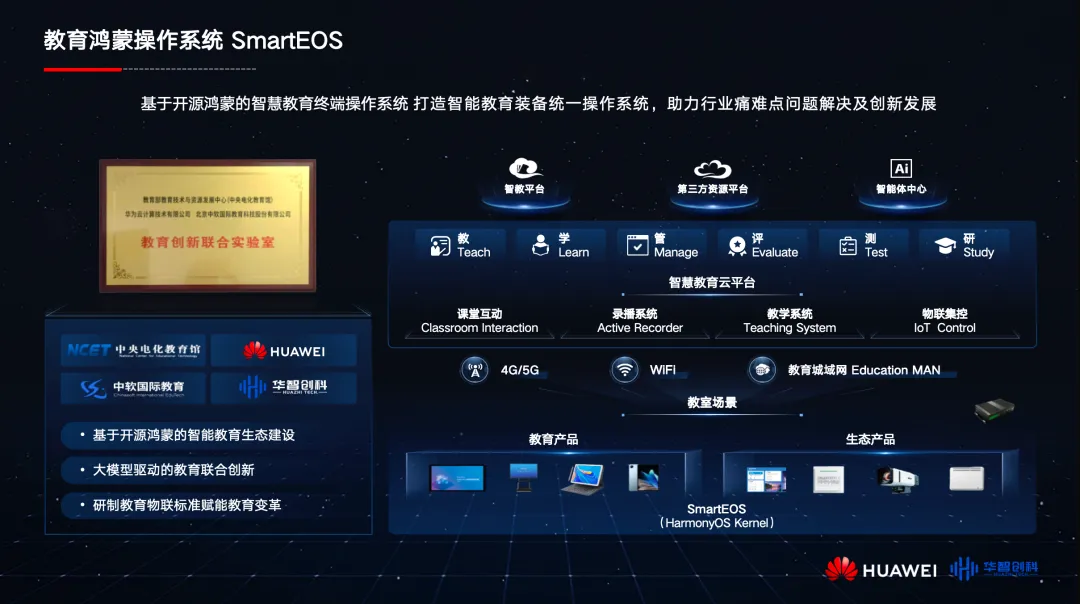 作为解决方案的核心技术底座,华智创科联合华为推出了SmartEOS操作系统,是基于开源鸿蒙研发的,结合教育场景需求,具备自主可控、开源开放、实时响应、低门槛开发等核心特性,深度适配国产芯片,能够最大限度发挥硬件性能,降低对国外软硬件技术的依赖,为智慧教育场景下的各类终端设备提供稳定、高效的运行支撑,同时支持多智能体协同工作,为后续教育场景的创新拓展奠定坚实基础。