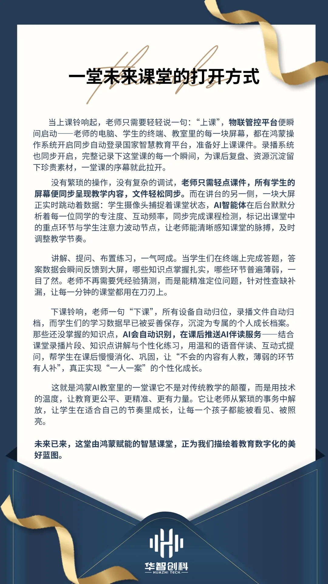 作为专注于数智教育领域的创新企业,华智创科始终坚持技术创新,依托华为鸿蒙生态的技术优势,深耕教育场景,持续优化产品与解决方案,推动AI与教育教学的深度融合,助力教育数字化转型落地见效。