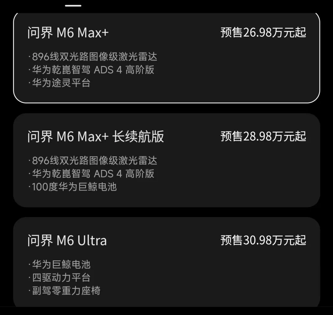 而Max+长续航版,则是电池度数比Max+大,如果是频繁有长途需求,可以考虑这一版本。至于Ultra车型,不仅电池度数更大,还有四驱和零重力座椅,这就适合对实用性、舒适性有更高要求的消费者。所以,如果你要下订问界M6,你知道该怎么选了吗?