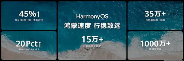 鸿蒙生态的蓬勃发展,正在被一组组亮眼数据有力印证:目前鸿蒙5与鸿蒙6终端设备数已突破5000万,日均新增设备数超15万,26年1季度用户日均下载/更新应用数环比提升45%,超35万应用及服务可供用户随时下载使用,鸿蒙注册开发者超1000万。此外,发布会上还公布了一个非常关键的数据:鸿蒙6的NPS值相比于鸿蒙5提升20个PCT,这不仅体现了用户满意度有大幅的提升,更是鸿蒙6市场渗透和品牌信任等多个维度上取得全面进步的综合体现。这一提升为鸿蒙6的未来发展提供了强大的动力和信心。