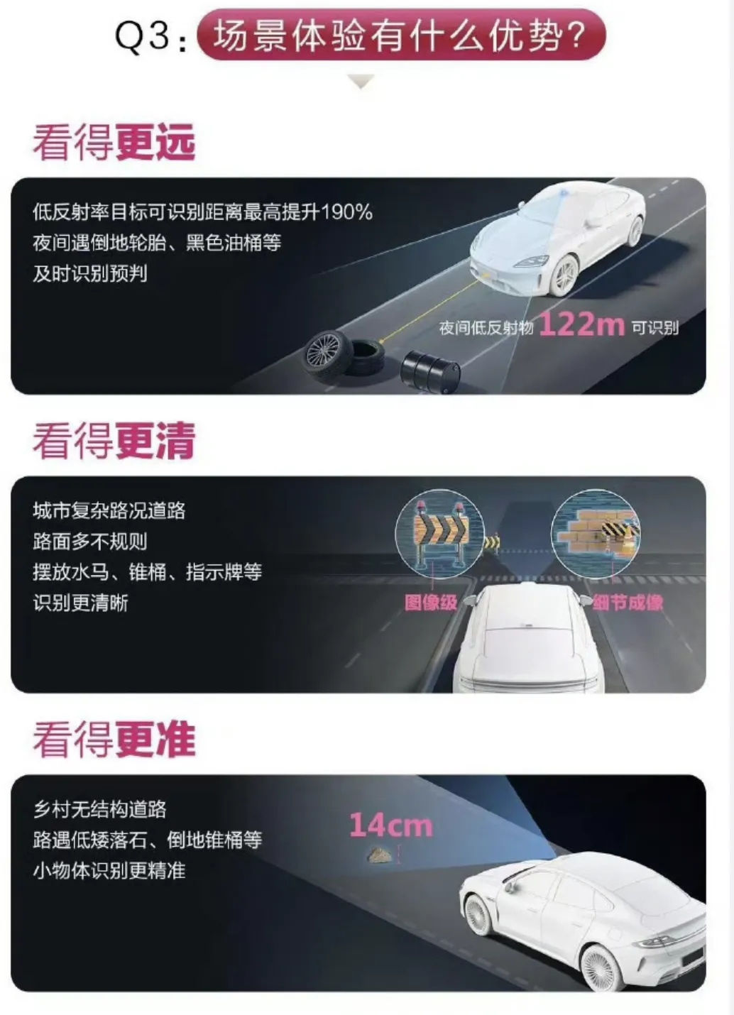 它采用了乾崑首创的双光路专利技术,能在120米外精准识别小到14厘米的目标,比如路上的碎石、锥桶等低矮障碍物。