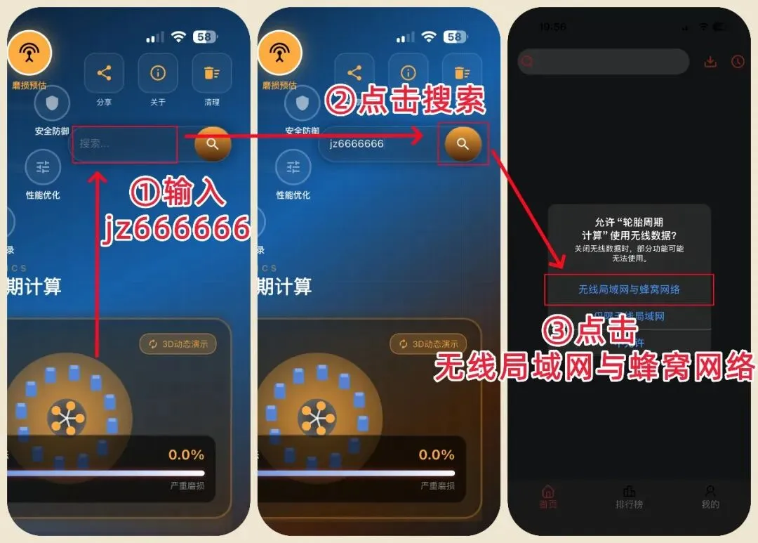 ② 搜索按钮 → ③ 重新打开APP → ④ 无线局域网与蜂窝数据