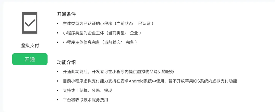 由此可见,意味着小程序开发者在经营过程中,若提供的虚拟商品,购买和支付等行为(包括虚拟货币、解锁功能、订阅内容、付费功能、打赏、购买虚拟礼物等为虚拟商品),需开通虚拟支付,且支付更多的技术服务费。