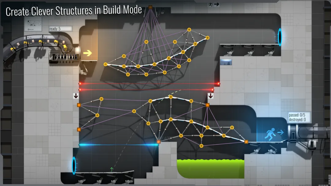 作为光圈科技测试实验室的新员工,你的工作是在60个测试室中建造桥梁、斜坡、滑梯和其他建筑,并让叉车安全通过终点线。