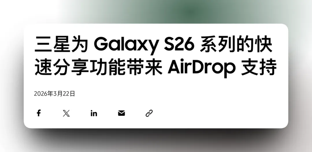 三星官方确认:Galaxy S26 系列将通过 Quick Share 更新支持 AirDrop,实现与 iPhone 的直接文件传输。