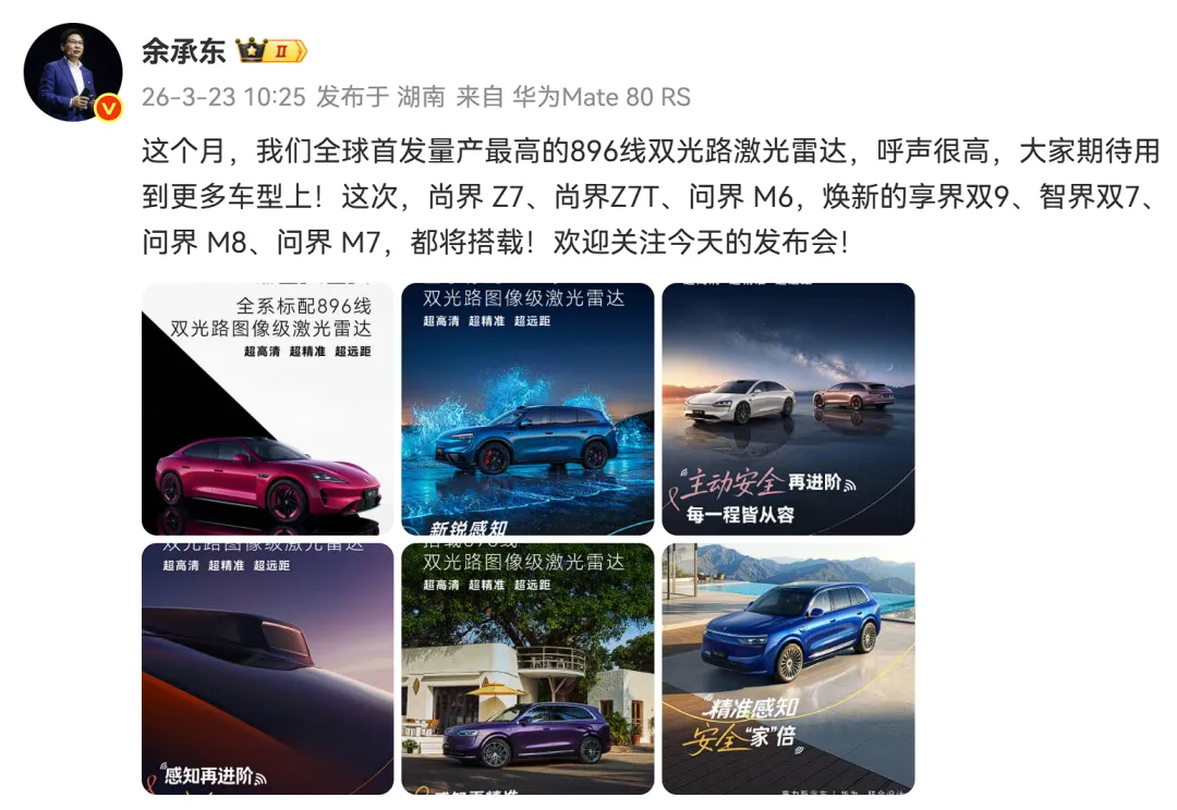 余承东官宣尚界 Z7、尚界 Z7T、问界 M6,焕新的享界双 9、智界双 7、问界 M8、问界 M7 等多款鸿蒙智行车型,将全系标配全球量产最高规格的 896 线双光路激光雷达。