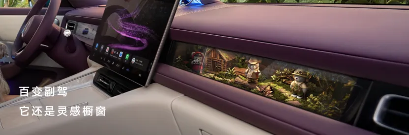 提供紫慕白、引力红、电光橙三款双拼色内饰,以及韶华杏单色内饰。座舱内创新采用“大脑洞”的“百变副驾”设计,支持墨彩相册、律动香氛等多种配件。灵感橱窗可作为年轻人的专属潮玩展台,陈列萌粒、迷你车模、官方磁吸IP公仔等,让副驾交互更有趣,内部支持磁吸,外部采用防爆钢化玻璃盖板,确保车内乘客安全。