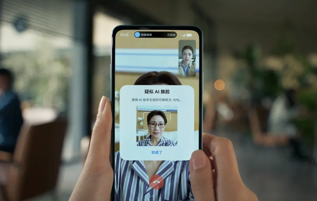 其次是AI换脸检测。当被守护人接到疑似AI换脸的视频通话时,手机会智能识别视频中的人脸是否为合成生成,并向守护人发送风险通知。在这个AI技术被滥用的时代,这个功能的价值不言而喻,它可能是阻止一场诈骗的最后一道防线。
