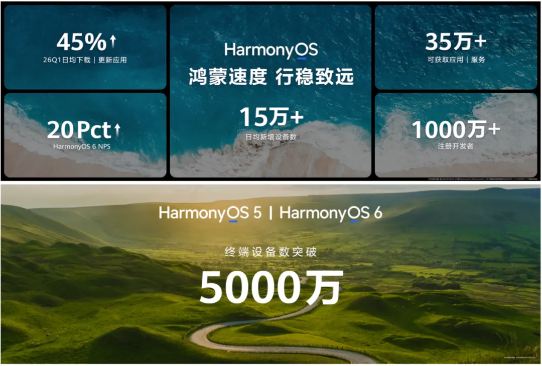 截至目前,搭载HarmonyOS 5及HarmonyOS 6的终端设备数突破5000万,日均新增设备数超15万,2026年1季度用户日均下载/更新应用数环比提升45%,HarmonyOS 6的净推荐值(NPS)相比于HarmonyOS 5提升20个PCT,超35万应用及服务可供用户随时下载使用,鸿蒙注册开发者超1000万。