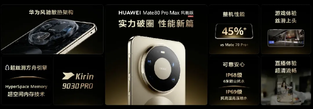 区别于普通Mate 80 Pro Max,该机将超长焦镜头替换为风驰散热模组——也就是内置的主动散热风扇,配合仿生羽翼涡扇与超导热弯流翅片,既保证了与普通旗舰一致的外观(隐藏式无感出风口设计),又大幅提升散热效率,可彻底“压榨”处理器极限性能。