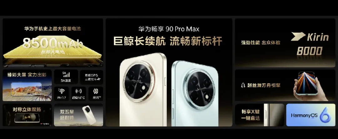 这意味着,华为将正式全面参与各价位段的市场竞争,尤其在千元机、中端机市场,凭借麒麟芯片与鸿蒙系统的协同优势,以及8500mAh巨鲸电池(畅享90 Pro Max)、WiFi7、北斗三频定位等越级配置,有望快速抢占被其他品牌占据的市场份额。