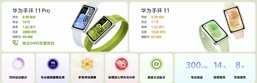 此次同步发布的手环11系列,同样区分配置与价格:基础版售价269元起,显示面积较上一代增加27%,支持实况窗提示、遥控拍照、来电提醒,以及睡眠、心理、呼吸、血氧饱和度等多维度健康监测,满足大众基础需求。