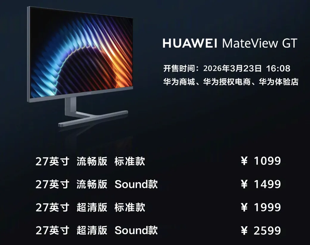显示器方面,27英寸华为MateView GT电竞显示器正式发布,起售价1099元,同时提供高清版、Sound款等多种配置版本,高清版侧重画质输出,Sound款新增专业音效配置,满足不同电竞与办公用户的需求。这些产品均依托鸿蒙系统作为核心枢纽,实现与手机、手表等设备的无缝联动,形成硬件+软件+生态的协同优势。