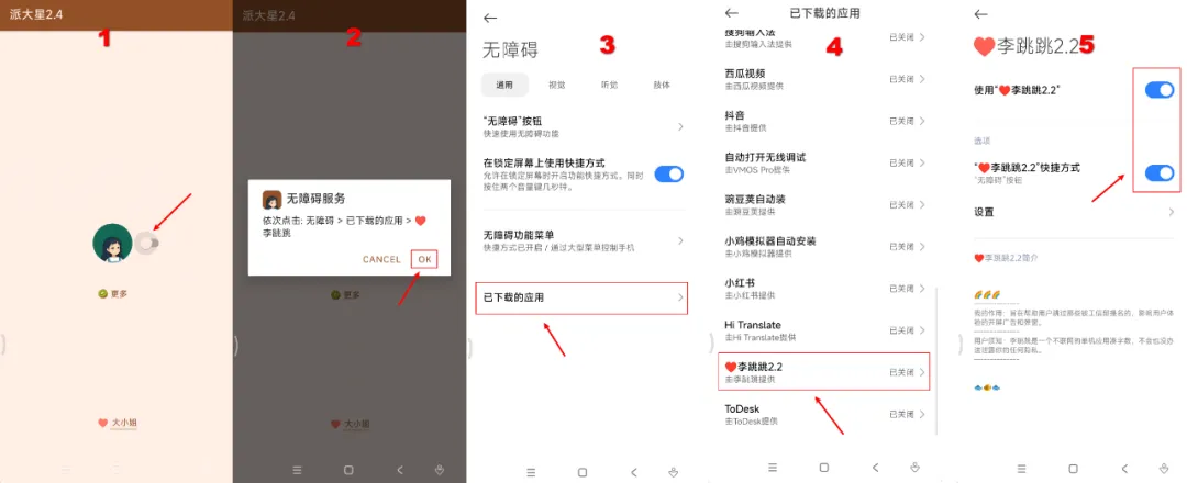 右边按钮→【OK】→【已下载的应用】→【李跳跳2.2】→两项全部点亮(如图5)