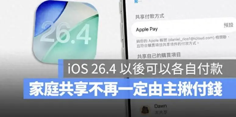 iOS 26.4 即将在下周正式发布,其中一项看似微小却解决多年痛点的更新,就是Apple 终于放宽了「家庭共享」的付款限制。从现在起,家庭群组中的成年成员不再被迫共用主揪的信用卡,可以选择使用自己的付款方式购买App 或订阅服务,不必再为了谁付钱而感到尴尬。