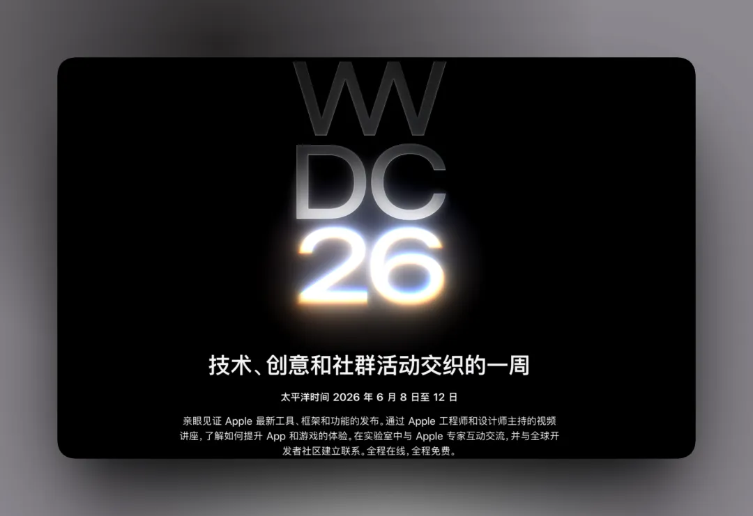 这场盛会依然以线上形式为主,但会邀请部分开发者/媒体和学生到 Apple Park 参与现场活动。对于全球开发者和果粉群体来说,这标志着苹果年度软件大更新的倒计时正式开始。