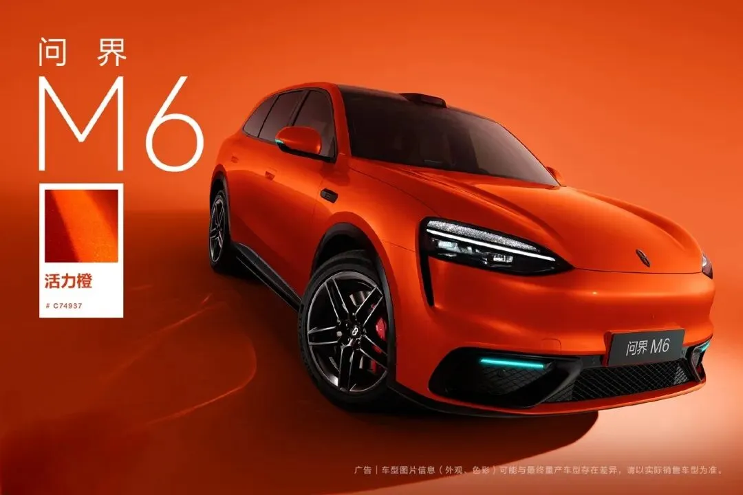 外观配色、造型,问界 M6 提供 7 种活力配色(如星叶紫、流光青)及黑曜运动套件,采用晶耀钻石切割灯组、轿跑溜背线条,车长 4960mm,轴距 2950mm,风阻系数仅为 0.239cd。拥有 1.915m 乘坐空间,至高 202L 容量智能前备箱。 内饰配色、功能,问界M6采用紫慕白、引力红、电光橙双拼配色,创新副驾“灵感橱窗”(磁吸钢化玻璃罩),支持更换手办、电子墨水屏(同步手机照片)或香氛模块。前排配备双零重力座椅(通风 / 加热 / 按摩),后排支持 29°-42° 电动调节,标配 7.3L 压缩机冰箱(-6℃ 至 50℃)。纯电版前备箱 202L(三重防夹开启),后备箱 882L 下沉式设计,带 10 个专用螺纹接口,可拓展露营桌、晾衣杆及 220V 电源。中控屏支持 15° 随动转向(向日葵交互),提供 26.1 英寸 AR-HUD;全车 21 处拓展接口(10 处磁吸点),磁吸旋钮可自定义控制空调、音量等,B 柱 / 座椅背隐藏挂钩强化实用性。