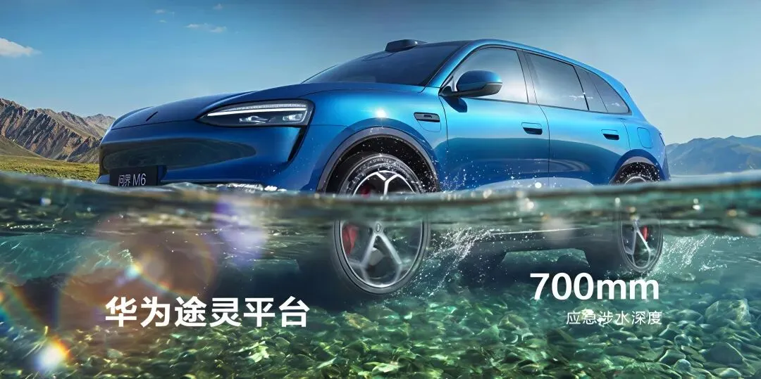 智能辅助驾驶软、硬件,问界 M6 全系搭载华为新一代 896 线图像级激光雷达(前向 + 后向固态雷达),配合华为 ADS 4.1 系统及 30 个感知硬件,可实现超高清、超远距障碍识别(如百米外小狗摇尾巴等细节动态) 动力、电池、续航、底盘,问界M6增程版搭载 37kWh/53.4kWh 电池 +60L 油箱,WLTC 续航最高 1400km;纯电版采用 800V 平台 +100kWh 巨鲸电池,续航 760km。新车标配华为途灵智能平台,避震搭载前双叉臂后五连杆 + 单腔空气悬架 +CDC 减震,涉水深度达 700mm。 问界M6车身采用 83.62% 高强度钢,A 柱 2000MPa 热成型钢,国内首发半固态镁合金结构件(减重 20%);9 气囊防护(含中央远端气囊),门把手采用三重机械应急开启设计,安全感十足。