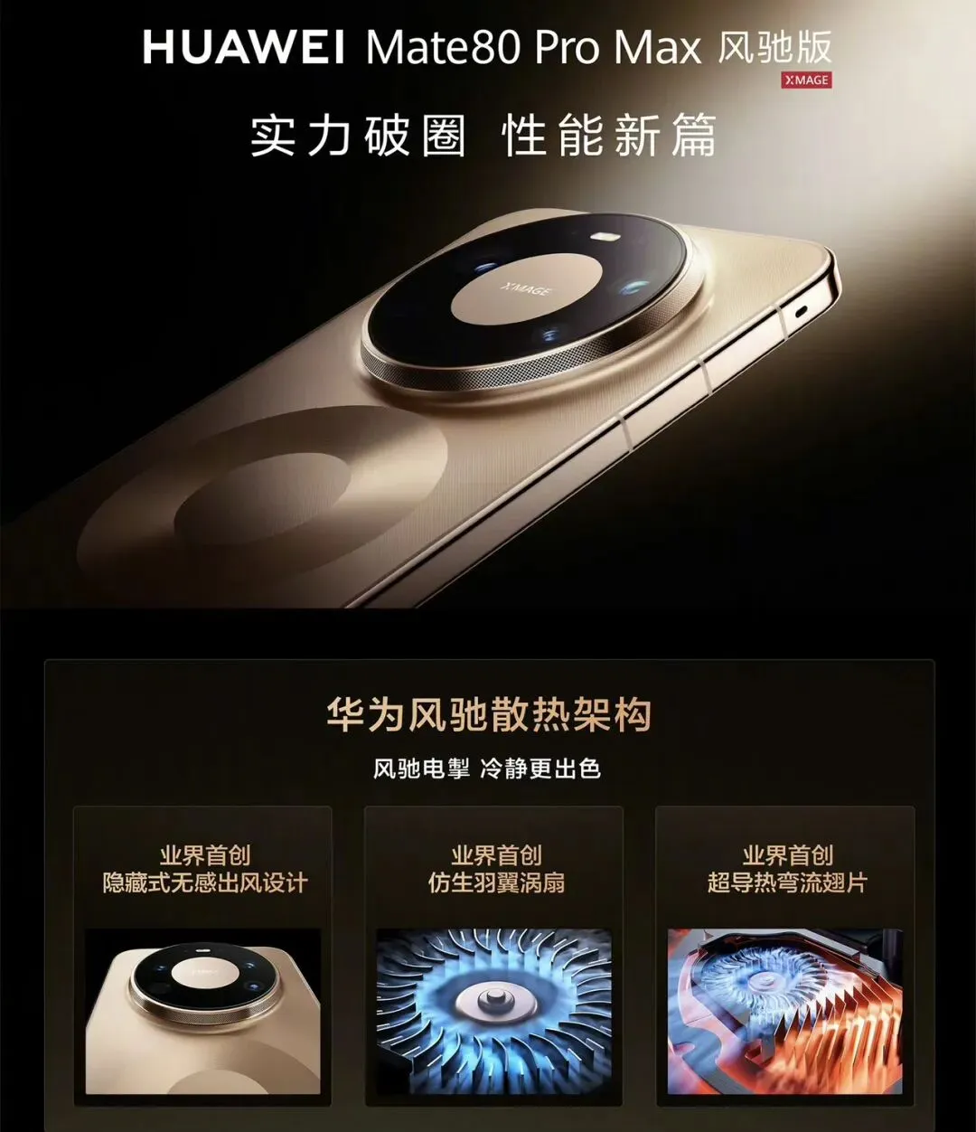 第一款是Mate80Pro Max风驰版:华为首款加入主动散热风扇的机型,业界首创隐藏式无感出风设计,通过镜头下放1200+激光微孔排除热量;业界首创仿生羽翼涡扇,同等噪音下风量提升60%;业界首创超导热湾流翅片,散热提升90%。