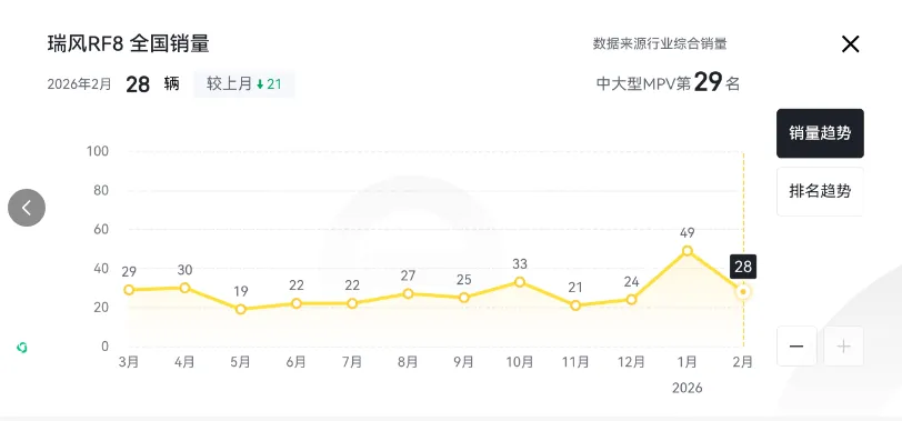 尽管产品力全面升级,但瑞风RF8面临的市场挑战不容忽视。根据行业数据,RF8在中大型MPV市场中销量基数较低,2026年2月全国销量为28辆,排名第29位。这一方面反映了MPV市场竞争的激烈程度,另一方面也说明品牌在高端家用市场的认知度仍需提升。