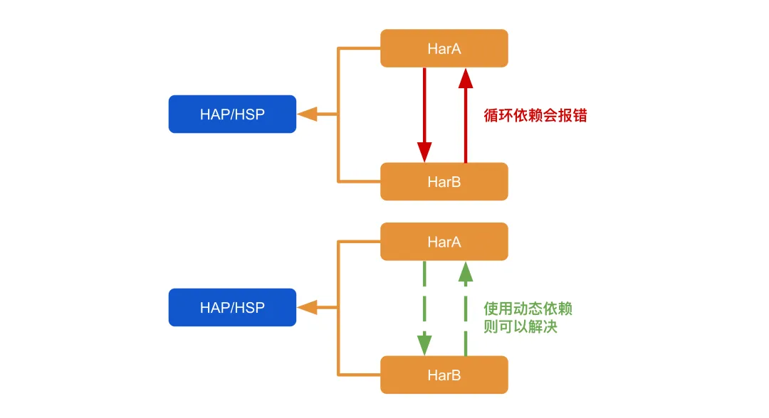 同时需要移除 HarA 和 HarB 在 oh-package.json5 中对彼此的静态依赖配置。
