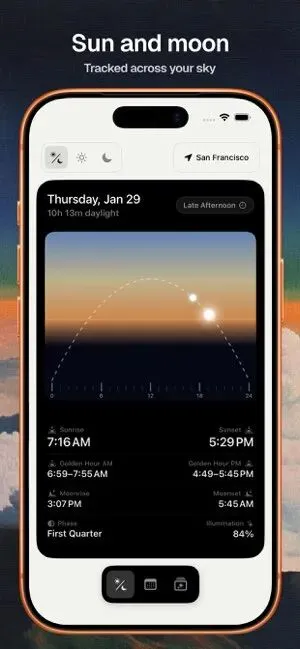 Solar Arc价格:¥38→0元语言:英文系统:iOS 18.6+推荐:★★★☆☆ 一款太阳月亮追踪应用,可帮用户精准获取黄金时刻、日出、月升等天象时间,适配摄影、户外徒步等场景。设有两种核心模式:ARC模式实时呈现日月运行轨迹,Gradient模式以色彩渐变直观展示全天光影时段,界面随真实天象动态变化,无需读取复杂数据即可快速获知信息。 |