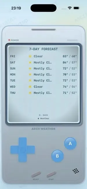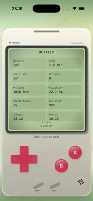 字符天气价格:¥8→0元语言:中文系统:iOS 17.6+推荐:★★★☆☆ 一款主打复古掌机风格的趣味天气应用。它调用苹果官方天气数据,搭配ASCII字符动画、按键交互与怀旧界面,可查询实时天气、逐小时预报、7日趋势、天气预警,还支持查看日出月相等天文信息,适配多尺寸主屏小组件,提供多套复古视觉主题可选。 |