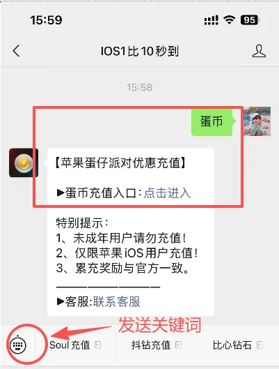 再次提醒:苹果用户如需充值,请关注公众号【iOS1比10秒到】,在对话框回复关键词蛋币,即可通过微信支付渠道,安全、便捷地完成充值。