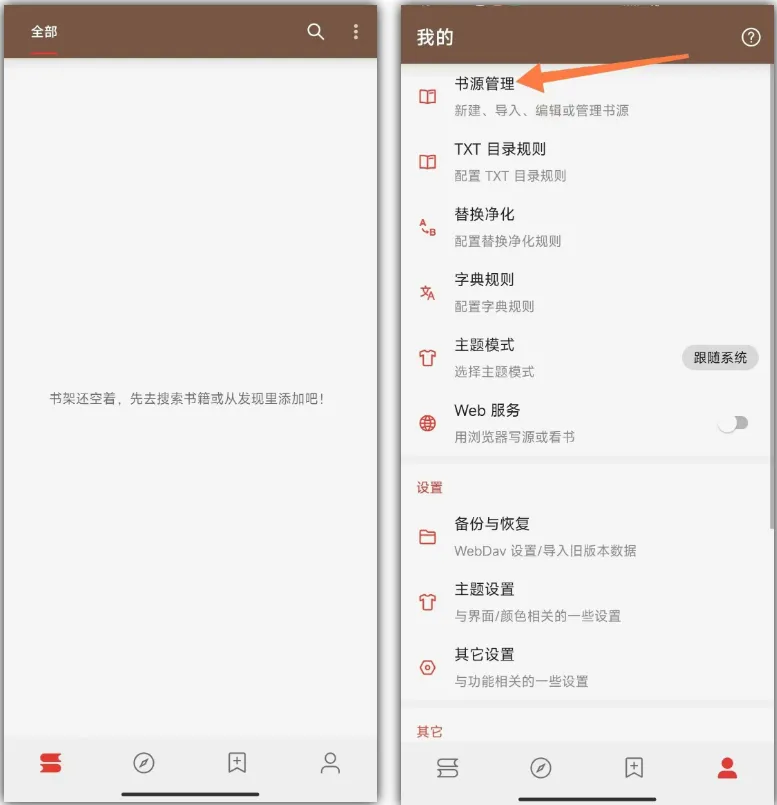 打开这个软件之后,你会发现里面空空如也,但不要慌,这是正常的,我们可以通过导入源的方式获取网络上大部分的小shuo资源。