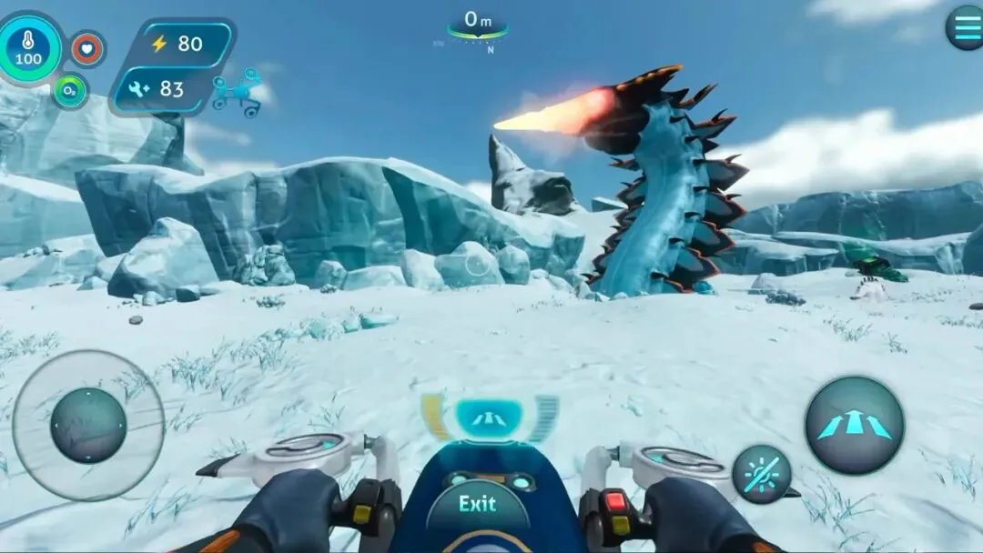 你扮演的并非初代的主角,而是为了调查姐姐离奇失踪真相的科学家,在一场坠机事故后,你带着寥寥无几的装备,踏上了这片被冰雪与未知笼罩的极地海域。游戏最核心的变革在于双环境生存压力的叠加——你不仅要管理氧气、饥饿与口渴,还必须时刻与“体温”这个全新的死神博弈:刺骨的寒流会在你探索冰面洞穴时无情地吞噬体温,逼迫你寻找热能百合或紧急制作的保温装备,才能从冻僵的边缘挣扎回来。这片名为“冰川盆地”与“扭曲之桥”的世界被设计成三层垂直无缝的立体地图,从白雪皑皑的冰原苔藓,到冰层下蓝光幽微的蜿蜒洞穴,再到深海热喷口旁闪烁着荧光的水晶区,所有区域均无加载画面的自由穿行,将探索的沉浸感推向极致。