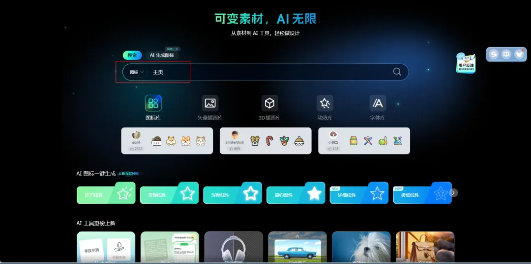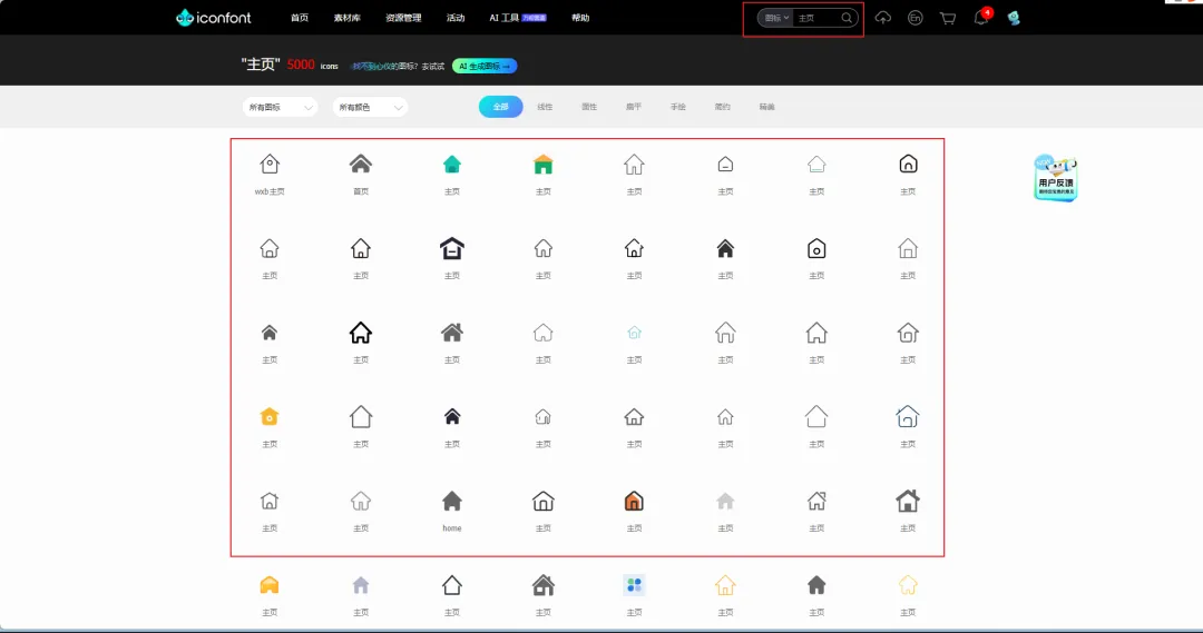 Iconfont官网首页比如我搜索“主页”,瞬间就能找到 5000+ 个相关图标,选择多到眼花缭乱!