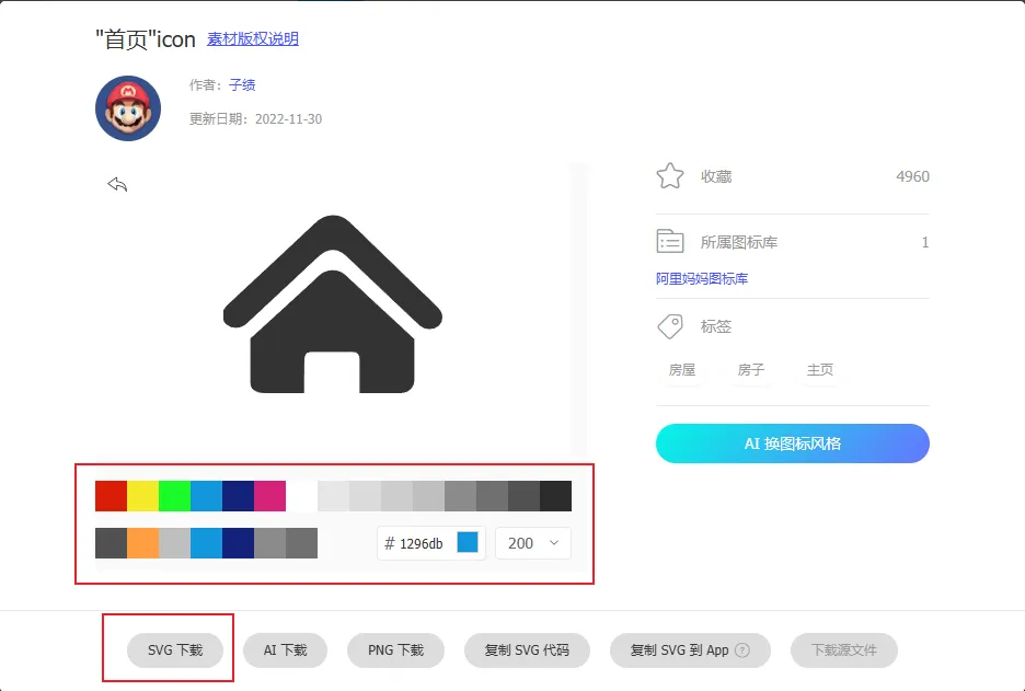 点击下载按钮在弹出的窗口中,你可以自定义颜色和下载格式(务必选择 SVG)。下载完成后,即可直接导入项目使用。