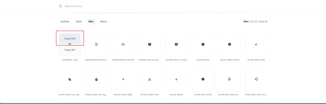 点击任意图标,它会自动复制 SVG 代码 到你的剪贴板。
