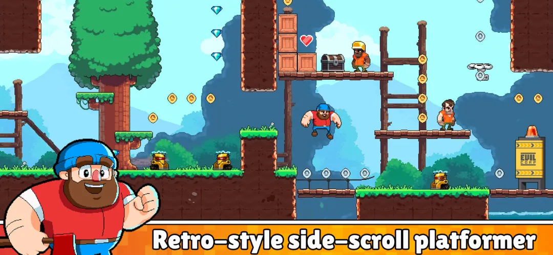 现已加入Timberman的世界!尽情体验复古2D平台风格与16位像素风格经典美学的极致融合。跟随伐木工开启一段大冒险,和他一起帮助好朋友小熊与家人团聚。挑战邪恶军团,拯救同伴,从工业化的魔爪中救下整片森林。