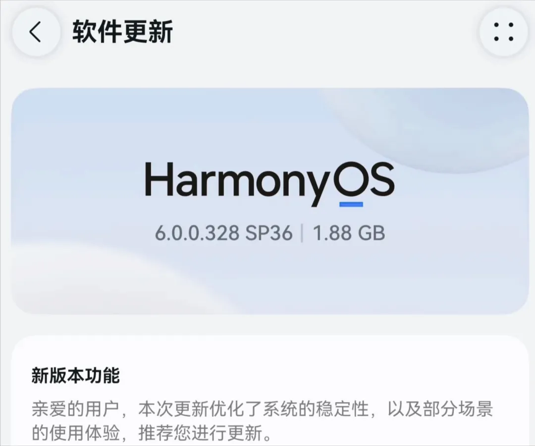 这两天,很多华为用户的屏幕上都弹出了一个极其庞大的更新提示。安装包足足有1.88GB,版本号是鸿蒙6的最新SP36版。