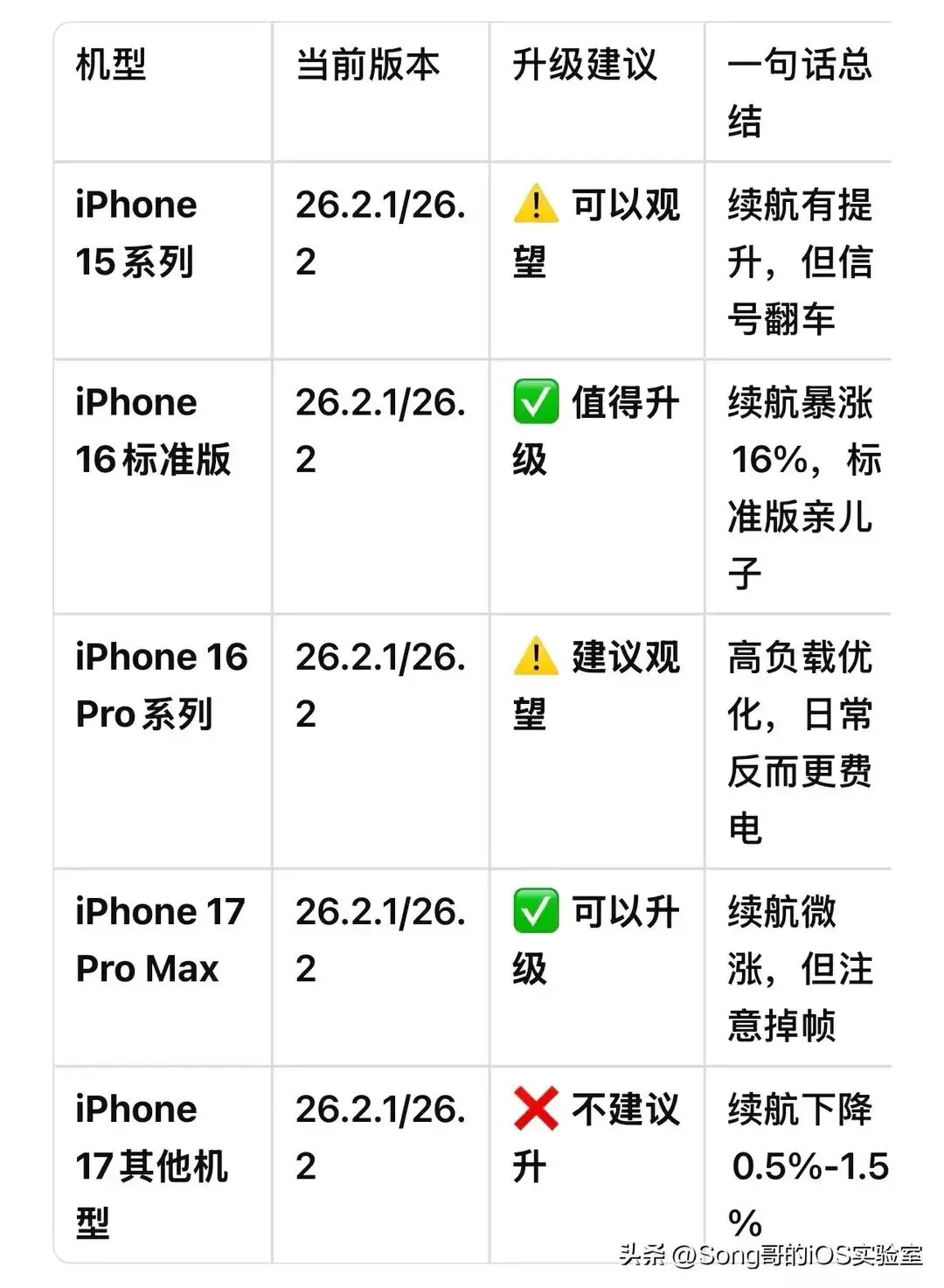 这个问题太经典了!阿song翻遍国内外论坛、整理了几十份实测数据,给你扒出了15系列、16系列、17系列从26.2.x升级到26.3.1的真实答案。