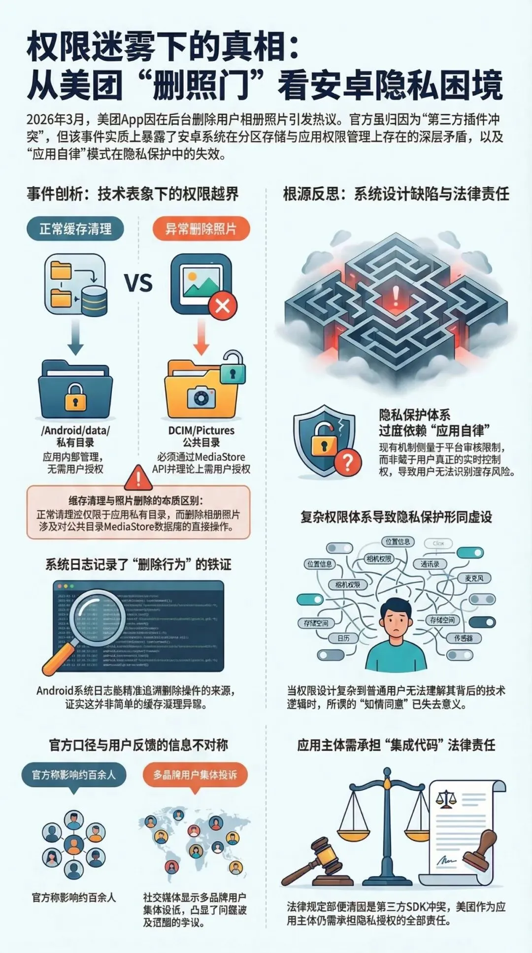 “美团删照”会是一次普通 Bug么。我更愿意把它看成一次压力测试:当一个 App 能让用户分不清“清缓存”还是“删相册”,隐私保护其实已经输了。3月24日,这事冲上热搜。美团回应称:个别安卓系统版本下,第三方插件冲突导致缓存清理异常,已修复;累计有180多位用户咨询,预计潜在影响数百人。问题不在“有没有解释”,而在这个解释能不能自洽。Android 官方文档写得很清楚:在启用 Scoped Storage 后,应用通常只能直接修改自己创建的媒体文件;如果要改或删其他应用创建的媒体文件,必须走额外授权流程,比如捕获RecoverableSecurityException,或在 Android 11+ 使用createDeleteRequest()触发系统确认。明白了没,“清缓存”和“删用户照片”不是一回事。缓存通常在应用私有目录里;而用户相册里的照片、视频属于共享媒体存储。官方文档明确区分了“应用自有媒体”与“其他应用创建的媒体”,后者的访问与删除权限更严格。所以这次真正让人不安的,不只是照片丢了,而是:为什么用户会感觉自己根本没控制权?Android 这些年一直在补洞。官方机制包括:— 分区存储,限制 App 乱碰别人的文件;— 删除/修改他人媒体文件时弹系统授权;— Android 11+ 支持批量删除请求;— Android 12+ 还有更高阶的 media management 特殊权限路径。但问题是:机制存在,不等于用户真的安全。这次事件暴露的核心矛盾是:Android 的隐私保护仍然偏“工程逻辑”,不是“用户逻辑”。工程师知道 MediaStore、URI、异常捕获、权限分级。普通用户只看到两件事:1)照片没了;2)日志里写的是“美团删了”当保护机制复杂到用户无法理解,系统就算“合规”,体验上也已经失效。更值得警惕的是,很多厂商和平台现在解决问题的思路,还是“加强审核”“约束 SDK”“要求自律”。但这套逻辑有个先天缺陷:它默认应用会按规则来,而真正有效的隐私设计,应该默认应用、插件、SDK、系统兼容层都可能出错。隐私保护最该防的,从来不只是恶意,也包括“看起来像事故的系统性失控”。这里给一个不那么顺耳但更准确的判断:这件事未必足以证明 Android 架构彻底失败,但足以证明它在“可理解的用户控制”上远远不够。这事真正该推动的,不只是美团赔偿,而是三件更硬的改造:第一,所有批量媒体删除必须默认高亮、强确认、可回滚。第二,第三方 SDK 的文件操作权限要单独可见、可审计。第三,系统日志要从“技术可读”变成“用户可读”。别再让用户在“被删完之后”才知道谁动了他的照片。这不是小 Bug,这是移动互联网把“便利”建在“不可见权限”上的老问题,终于又爆了一次。